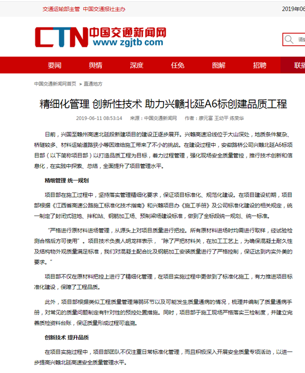 近日,中國交通新聞網(wǎng)以《精細(xì)化管理 創(chuàng)新性技術(shù) 助力興贛北延A6標(biāo)創(chuàng)建品質(zhì)工程》為題,對(duì)公司承建的江西興贛北延A6標(biāo)項(xiàng)目建設(shè)進(jìn)行了專題報(bào)道。