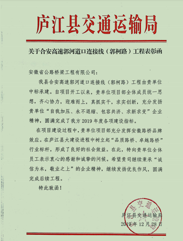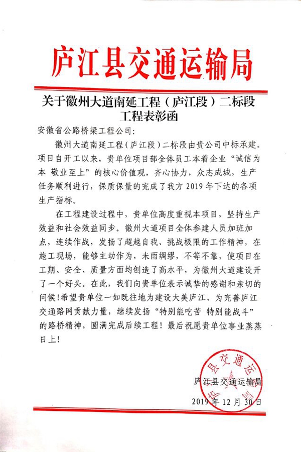 近日,公司收到廬江縣交通運(yùn)輸局寄來(lái)的表?yè)P(yáng)信,對(duì)徽州大道南延工程(廬江段)二標(biāo)段、湯池大道建設(shè)工程(合銅路至郭河段)二期及合安高速郭河道口連接線(郭柯路)工程等三個(gè)項(xiàng)目積極克服各類困難,高標(biāo)準(zhǔn)、嚴(yán)要求推進(jìn)施工生產(chǎn)給予表?yè)P(yáng)和感謝。