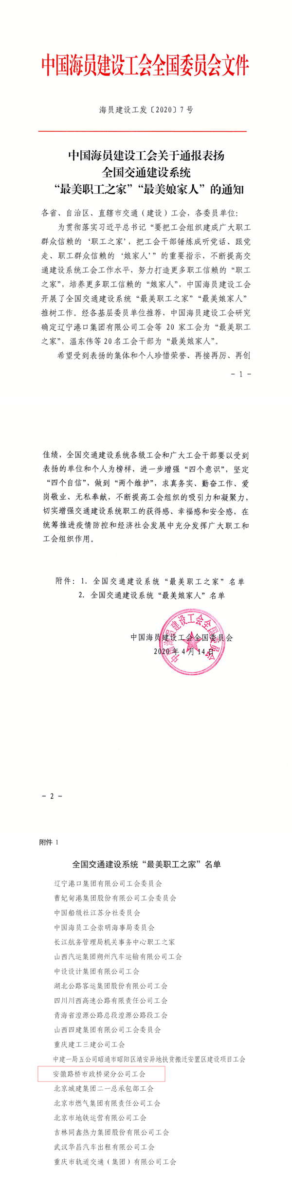 近日,中國海員建設(shè)工會(huì)全國委員會(huì)下發(fā)通知,通報(bào)了全國交通建設(shè)系統(tǒng)“最美職工之家”評(píng)選結(jié)果,市政分公司工會(huì)成為安徽省唯一一家獲此殊榮的基層工會(huì)。
