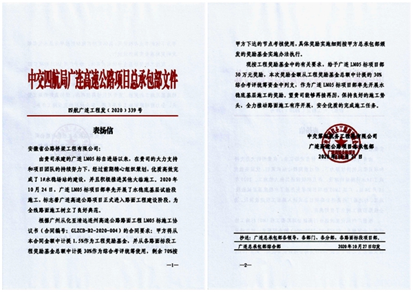 近日,中交四航局廣連高速公路項目總承包部發(fā)來表揚信,對公司承建的廣連高速05標優(yōu)質高效完成1#水穩(wěn)場站建設和率先啟動水穩(wěn)底基層試驗段施工給予表彰。