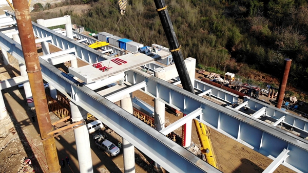 下葉村特大橋全長1440米,上部結(jié)構(gòu)采用40米鋼板組合梁。首片架設(shè)的橋面板重約36.6噸,采用短線匹配法工藝預(yù)制,該工藝為我省首次應(yīng)用于橋面板預(yù)制,具有預(yù)制精度高、安裝速度快等特點(diǎn)。橋面板首件順利安裝,標(biāo)志著該大橋進(jìn)入鋼板組合梁、板同步架設(shè)施工階段。