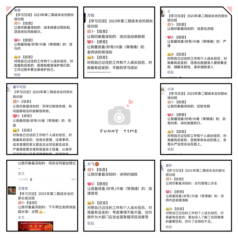 本次培訓班課程由公司內(nèi)部培訓師講授,課程設(shè)置方面注重以立足公司生產(chǎn)實際的真實案例進行分析,旨在強化項目成本合約部長必備的專業(yè)技能和職業(yè)素養(yǎng),具體包括項目成本策劃、合約部信息化操作、項目合同管理法律風險防范、合約部基礎(chǔ)管理、二次經(jīng)營、紀檢專題培訓、情緒與壓力管理等內(nèi)容。