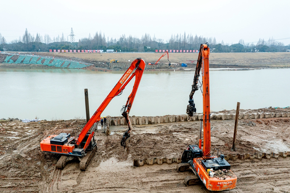 青弋江特大橋主墩鋼圍堰平面尺寸長(zhǎng)40米、寬16.2米、高18米、標(biāo)高7.5米,共計(jì)390根鎖口拉森鋼板樁,施工方案為東、西兩岸主墩圍堰施工同步進(jìn)行。除夕前夜,隨著青弋江東岸最后一根鎖口拉森鋼板樁施工結(jié)束,該橋正式轉(zhuǎn)入圍檁施工階段,全面掀起了春節(jié)施工大干熱潮。截至大年初五,項(xiàng)目順利完成第一道圍檁施工任務(wù),為春節(jié)期間全面完成圍檁施工任務(wù)奠定了堅(jiān)實(shí)的基礎(chǔ)。