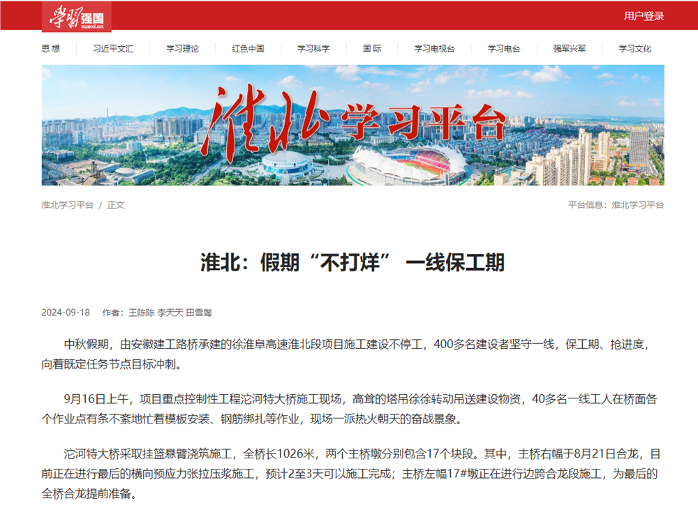 中秋假期,安徽建工路橋建設者堅守崗位一線,搶抓施工“黃金期”,沖刺節(jié)點目標,跑出實干“加速度”,受到多家主流媒體聚焦報道。