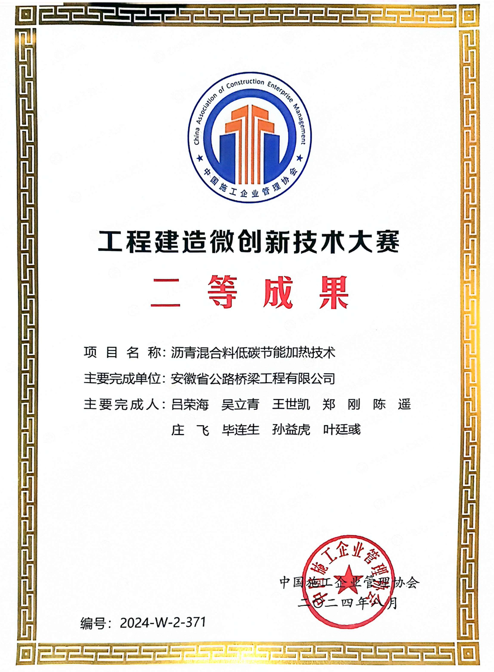 建設(shè)公司始終牢記“科技創(chuàng)新試驗田”定位,在項目建設(shè)過程中大力開展技術(shù)創(chuàng)新工作,積極推動創(chuàng)新成果轉(zhuǎn)化,不斷提高核心競爭力。研發(fā)的“瀝青混合料低碳節(jié)能加熱技術(shù)”,通過不同加熱技術(shù)的互補(bǔ)實現(xiàn)瀝青混合料加熱技術(shù)的資源節(jié)約、成本控制以及污染減排效益最大化,今年以來該技術(shù)的應(yīng)用已節(jié)省施工成本近600萬元。該項創(chuàng)新技術(shù)榮獲中國施工企業(yè)管理協(xié)會工程建造微創(chuàng)新技術(shù)大賽二等獎、安徽省交通科技進(jìn)步一等獎、國資委省屬企業(yè)原創(chuàng)技術(shù)研發(fā)攻關(guān)項目。2024年以來,建設(shè)公司已先后榮獲省級優(yōu)秀質(zhì)量管理小組成果14項,中國公路學(xué)會第五屆全國公路微創(chuàng)新大賽銅獎1項,中施企業(yè)綠色低碳施工工法1項,完成公司四項科研課題立項工作。