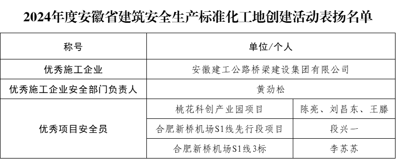 近日,安徽省建設(shè)工程與質(zhì)量安全協(xié)會(huì)發(fā)布表揚(yáng)通知,公司榮獲“2024年度安徽省建筑安全生產(chǎn)標(biāo)準(zhǔn)化工地優(yōu)秀施工企業(yè)”稱號(hào),公司安全環(huán)保部黃勁松同志榮獲“2024年度安徽省建筑安全生產(chǎn)標(biāo)準(zhǔn)化工地優(yōu)秀施工企業(yè)安全部門負(fù)責(zé)人”稱號(hào),桃花科創(chuàng)產(chǎn)業(yè)園項(xiàng)目、合肥新橋機(jī)場(chǎng)S1線先行段項(xiàng)目、S1線3標(biāo)等3個(gè)項(xiàng)目安全管理人員榮獲“優(yōu)秀項(xiàng)目安全員”稱號(hào)。
