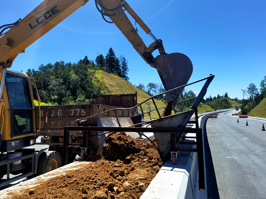 中分填土實(shí)現(xiàn)零污染。傳統(tǒng)高速公路中分帶培植用土施工,極易造成路面污染。為解決該難題,公司創(chuàng)新研發(fā)中分帶新澤西護(hù)欄間填土漏斗裝置,根據(jù)現(xiàn)場護(hù)欄尺寸、填土高度,制作填土漏斗,填土施工通過漏斗槽滑入護(hù)欄內(nèi)部,避免外溢,同時(shí)漏斗可以在護(hù)欄頂部和側(cè)面自由滑動,實(shí)現(xiàn)中分帶填土零污染施工,有效保證路面清潔施工,較傳統(tǒng)工藝施工效率提高50%左右。