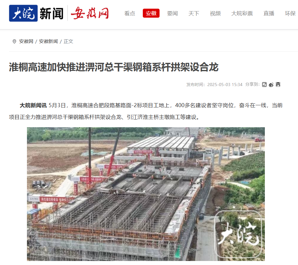 “五一”期間,公司承建的合肥新橋國際機場綜合交通中心項目、淮桐高速合肥段路基2標、S235濉唐路三期項目、徐淮阜高速淮北段項目、S20長固高速路基01標等一批項目“火力全開”,奮戰(zhàn)二季度,在江淮大地奏響項目建設(shè)“協(xié)奏曲”,受到央廣網(wǎng)、學(xué)習(xí)強國、安徽新聞聯(lián)播、大皖新聞等多家主流媒體的關(guān)注報道。