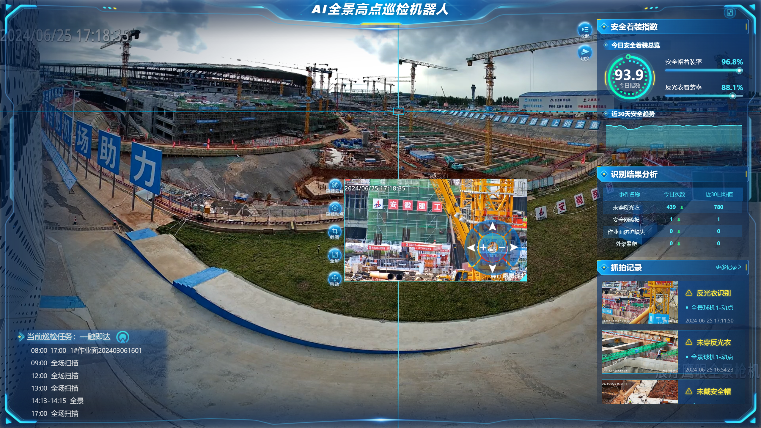AI高點(diǎn)巡檢機(jī)器人的登場(chǎng),革新了傳統(tǒng)巡檢模式。通過(guò)運(yùn)用錐面拼接技術(shù),將傳統(tǒng)視頻監(jiān)控的視野短板一掃而空。自動(dòng)巡檢時(shí),動(dòng)點(diǎn)攝像頭精準(zhǔn)捕捉人員違規(guī)行為,對(duì)安全隱患實(shí)時(shí)抓拍記錄。結(jié)合AI算法,切實(shí)解決了人工巡檢的耗人耗時(shí)難題,同時(shí)隱患識(shí)別準(zhǔn)確率提高至98%,單項(xiàng)目巡檢成本銳減50%~70%,全程保障了“零事故”作業(yè)。