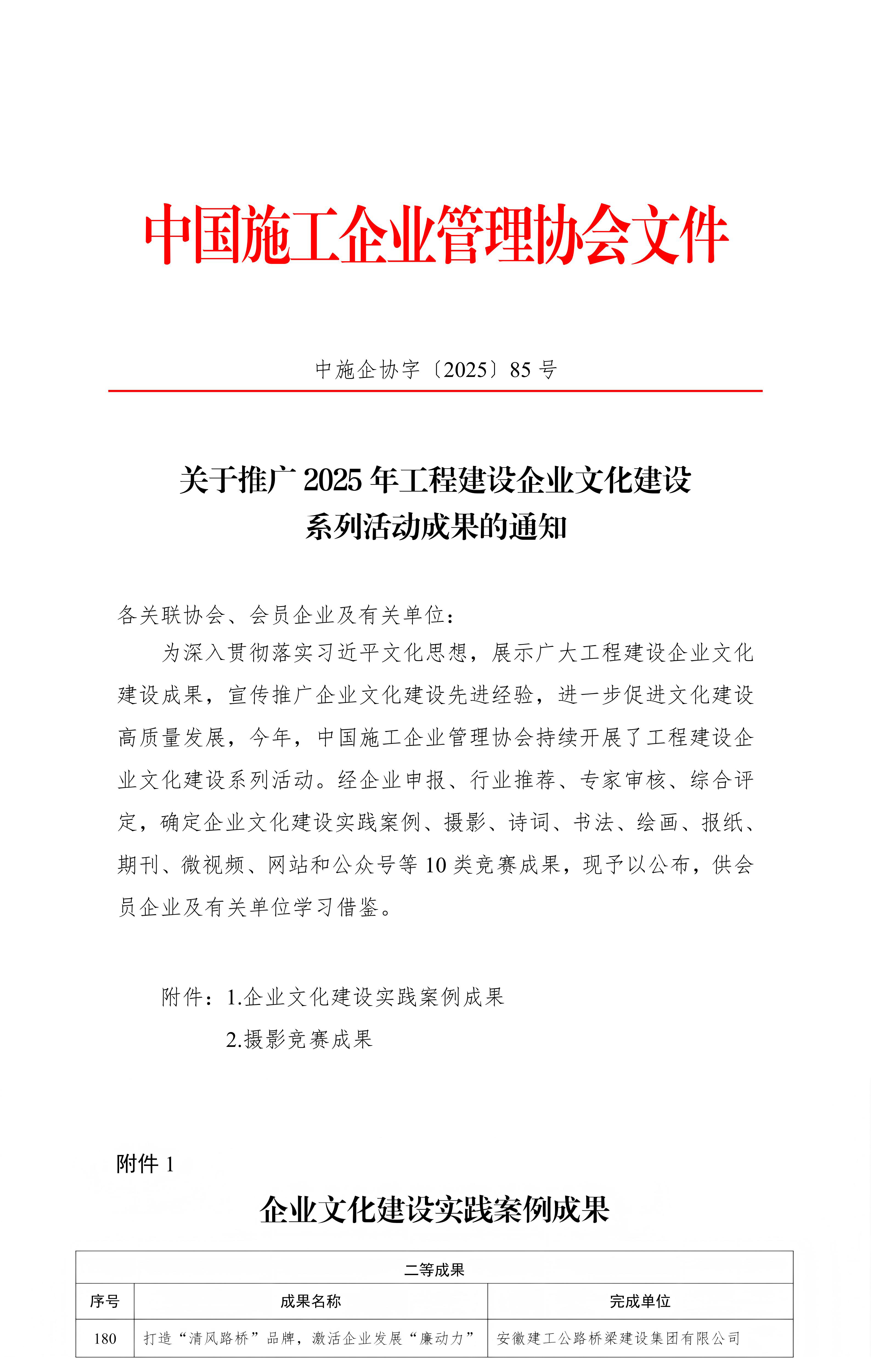 近日,中國施工企業(yè)管理協(xié)會(huì)公布了2025年工程建設(shè)企業(yè)文化建設(shè)實(shí)踐案例成果評(píng)選結(jié)果,公司《打造“清風(fēng)路橋”品牌,激活企業(yè)發(fā)展“廉動(dòng)力”》從全國眾多申報(bào)案例中脫穎而出,榮獲企業(yè)文化建設(shè)實(shí)踐案例二等成果。這是繼上半年公司“清風(fēng)路橋”廉潔文化品牌獲評(píng)2025年工程建設(shè)企業(yè)黨建工作典型案例后,再次獲得中國施工企業(yè)管理協(xié)會(huì)表彰,充分展現(xiàn)了公司在廉潔文化建設(shè)領(lǐng)域的持續(xù)深化與品牌影響力。