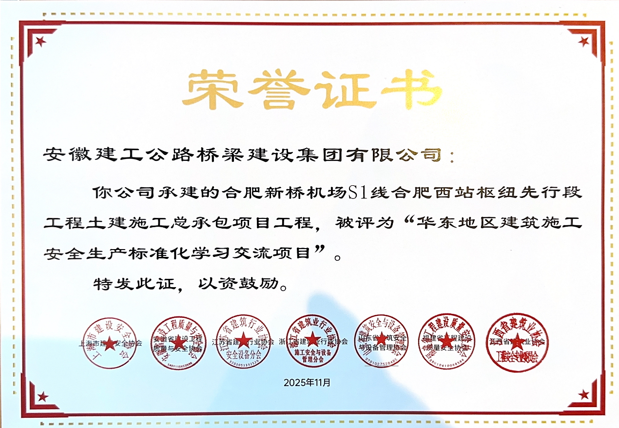 近日,華東地區(qū)建筑安全聯(lián)席會公布了“2025年度華東六省一市建筑施工安全生產(chǎn)標準化工地學習交流項目名單”,公司承建的合肥新橋機場S1線土建施工總承包3標、合肥新橋機場S1線合肥西站樞紐先行段工程土建施工總承包項目光榮上榜。邵嘉兵、宋廣輝獲評優(yōu)秀項目經(jīng)理稱號,李蘇蘇、段興一獲評優(yōu)秀項目安全總監(jiān)稱號。