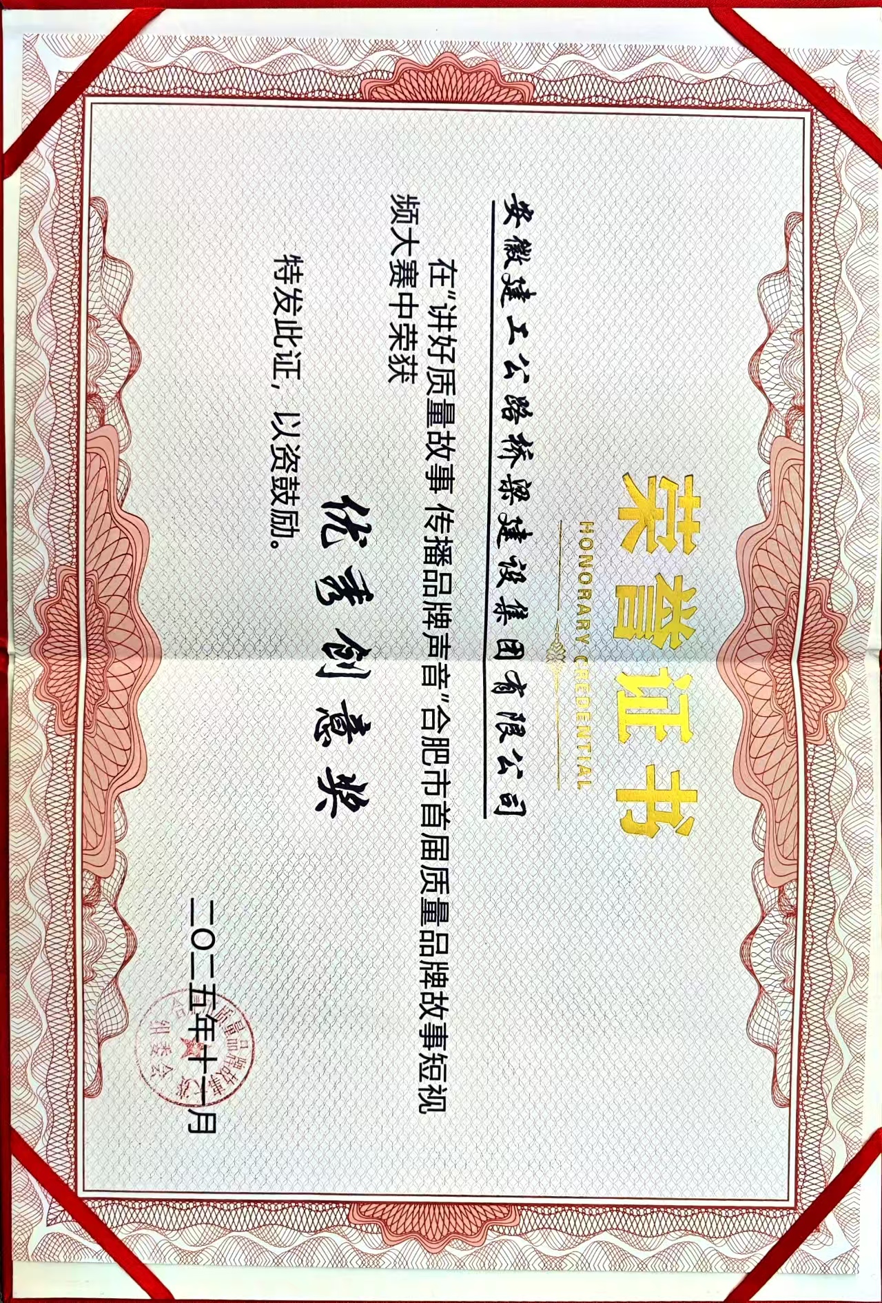 近日,合肥市2025年質(zhì)量品牌故事短視頻大賽頒獎(jiǎng)典禮圓滿落幕。公司參賽作品《井中智造:360°旋轉(zhuǎn)智能布料機(jī)澆筑合肥質(zhì)量新高度》榮獲“優(yōu)秀創(chuàng)意獎(jiǎng)”。