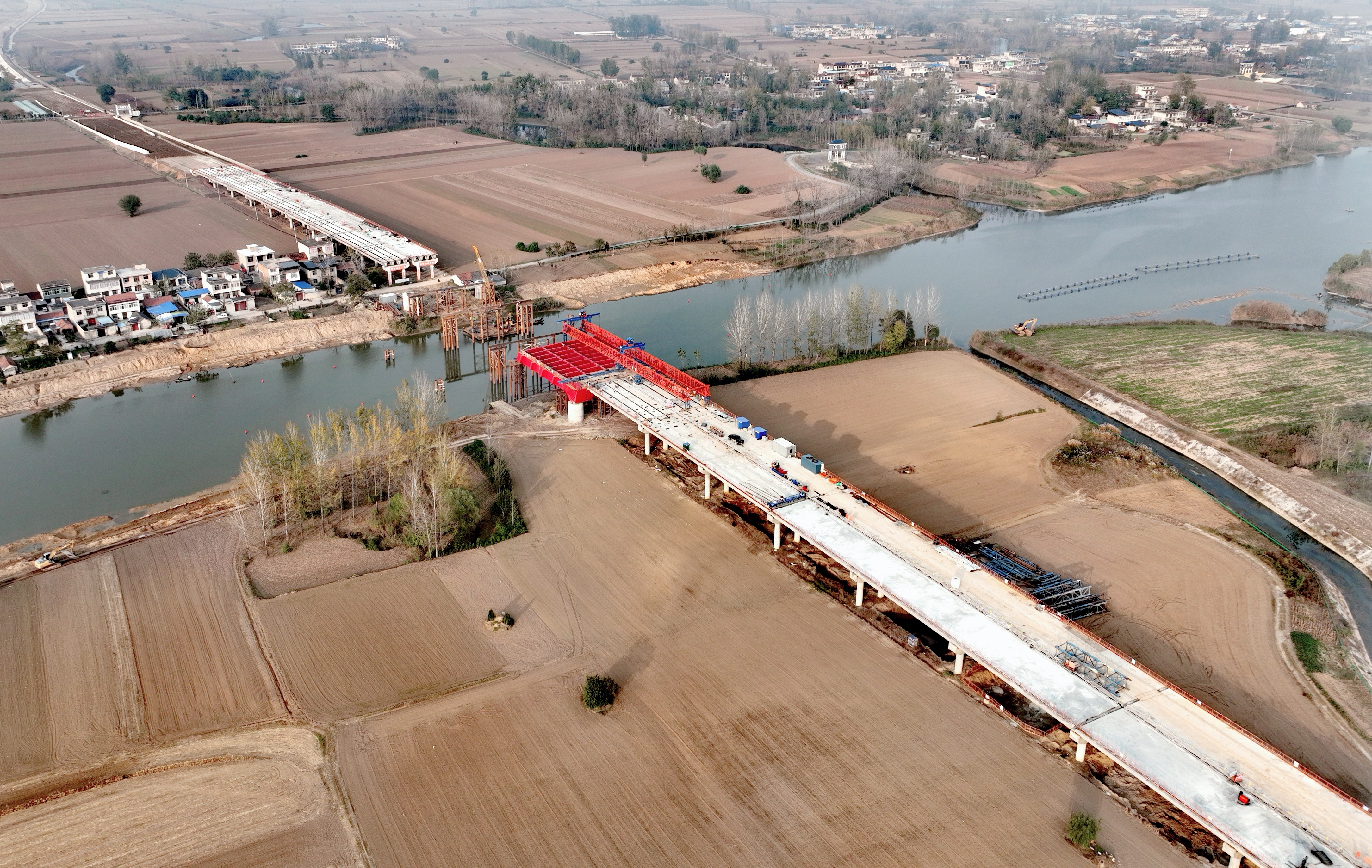 四季度以來,項(xiàng)目已完成多座橋梁的梁板架設(shè)及現(xiàn)澆板澆筑,累計(jì)架設(shè)30米箱梁48片、T梁172片。重點(diǎn)控制性工程澮河大橋于10月11日完成首片鋼箱梁架設(shè),實(shí)現(xiàn)以20%工期完成32%產(chǎn)值的目標(biāo)。當(dāng)前,項(xiàng)目正加快推進(jìn)路基連續(xù)交驗(yàn)與水穩(wěn)規(guī)?;┕ぃ鎲?dòng)橋梁上部結(jié)構(gòu)施工。