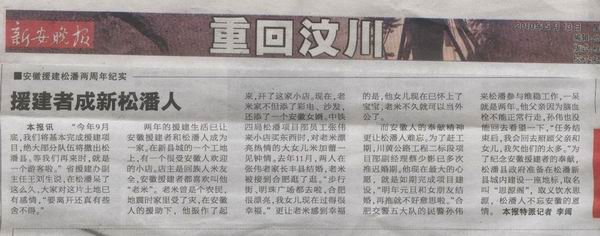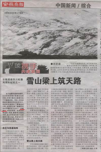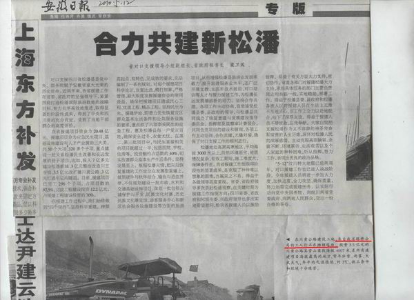 在“5.12”汶川大地震發(fā)生兩周年之際,安徽省路橋公司承建的我省對口援建四川松潘縣項目之一——漳黃公路道路改建工程02標(biāo)再次引起省內(nèi)各大主流媒體的高度關(guān)注。