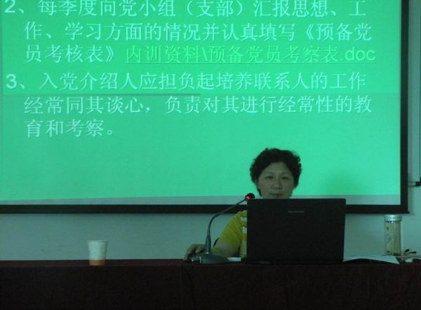 黨委辦公室主任劉昀主持了培訓(xùn)會(huì),并就發(fā)展黨員工作程序,作了專題講座。劉主任通過PPT課件,系統(tǒng)的介紹了黨員發(fā)展程序,從制訂發(fā)展黨員的工作計(jì)劃開始,到預(yù)備黨員轉(zhuǎn)正、整個(gè)入黨材料存入個(gè)人檔案,以及最后的責(zé)任追究都作了詳細(xì)介紹,讓與會(huì)人員對發(fā)展黨員工作的程序有了清楚的了解。隨后,大家一起觀看了《欲之害——段義和腐敗案件警示錄》。專題片揭露了段義和利用職務(wù)便利大肆索賄的腐敗行徑,深刻揭示了腐化墮落的思想根源和蛻變軌跡。通過觀看警示教育片,使大家接受了一次深刻的思想教育和精神洗禮,進(jìn)一步認(rèn)識(shí)了在新形式下反腐倡廉建設(shè)的重要性。
