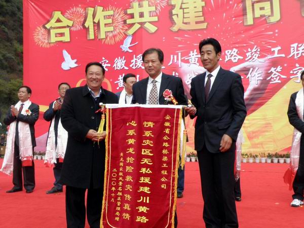 十月的松潘,金風(fēng)送爽,喜事連連。10月14日,安徽援建川黃公路竣工聯(lián)歡會暨黃山黃龍戰(zhàn)略合作簽字儀式在美麗的黃龍風(fēng)景區(qū)廣場隆重舉行。安徽省政府秘書長梁衛(wèi)國、省交通廳副廳長丁慶領(lǐng)及四川省、阿壩州、松潘縣各級領(lǐng)導(dǎo)出席儀式。我公司總經(jīng)理汪衛(wèi)東、黨委書記陳光磊以及漳黃02標項目經(jīng)理陳莘同志作為特邀嘉賓出席典禮。這標志著我安徽路橋?qū)谥г膳苏狞S公路建設(shè)任務(wù)的圓滿完成。