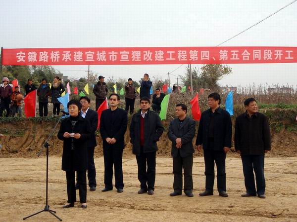 11月28日上午,在宣貍路改建工程第五合同段K34+740施工現(xiàn)場(chǎng)響起了歡快的鞭炮聲,鮮艷的彩旗熱情地歡迎四方賓朋,宣貍路改建工程第四、第五合同段開工儀式隆重舉行。出席儀式的有宣城市交通局總工程師、建委副主任夏志海、宣州區(qū)副區(qū)長(zhǎng)傅葵、宣州區(qū)交通局局長(zhǎng)胡學(xué)斌、宣州區(qū)宣貍路征遷協(xié)調(diào)組副組長(zhǎng)江國(guó)平、貍橋鎮(zhèn)書記楊承保、貍橋鎮(zhèn)鎮(zhèn)長(zhǎng)時(shí)國(guó)全、總監(jiān)代表邱旭光、駐地柏玉坤、安徽省路橋公司黨委書記陳光磊、副總經(jīng)理盛明宏以及朱橋和沈村鄉(xiāng)鎮(zhèn)領(lǐng)導(dǎo)、沿線村委會(huì)代表、村民代表等相關(guān)人員。