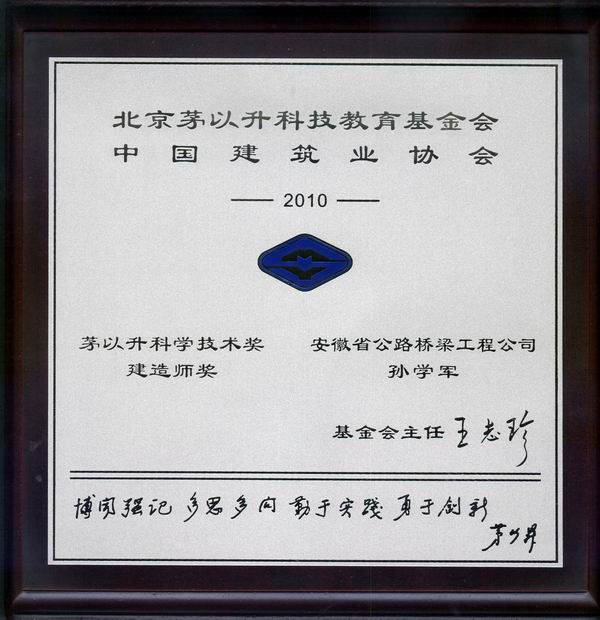 孫學軍主持建設了安徽省南照淮河大橋、沿江高速、廬銅高速、銅湯高速、合肥市徽州大道等工程項目,所建項目榮獲了國家優(yōu)質(zhì)獎“魯班獎”、省優(yōu)“黃山杯”等獎項,并獲省交通廳“優(yōu)秀施工單位”、合肥市委市政府“大建設先進集體”等榮譽。此外,他個人榮獲全國優(yōu)秀建造師、“魯班獎”工程優(yōu)秀項目經(jīng)理、“黃山杯”工程優(yōu)秀項目經(jīng)理等榮譽。