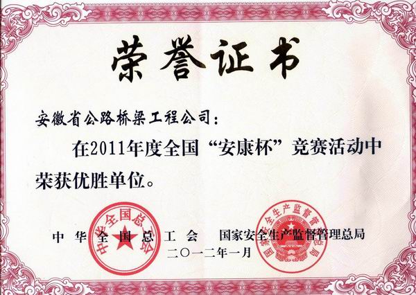 近日,公司喜獲全國(guó)“安康杯”競(jìng)賽優(yōu)勝單位稱(chēng)號(hào)。