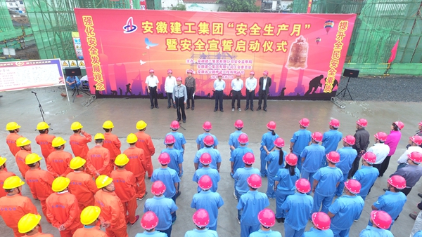 在集團(tuán)公司工會主席徐曉光的帶領(lǐng)下,所屬各單位領(lǐng)導(dǎo)、安全管理人員,郎溪路項目全體管理人員及一線工人約200人舉起右手,鄭重宣誓:“我是一名安徽建工人,我鄭重宣誓,時刻注意安全,遵守安全法規(guī)。履行安全職責(zé),提高安全技能。杜絕三違現(xiàn)象,保證四不傷害。強(qiáng)化紅線意識,促進(jìn)安全發(fā)展。為了家人幸福、企業(yè)發(fā)展,誓做建工‘安全人’”。莊嚴(yán)的誓詞久久回蕩在項目現(xiàn)場,更加堅定了全體建工人“強(qiáng)化紅線意識,促進(jìn)安全發(fā)展”的信心和決心。