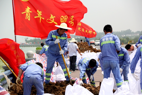風(fēng)雨同舟,眾志成城。在抗洪搶險現(xiàn)場,黨員突擊隊(duì)、青年突擊隊(duì)、工人先鋒號、青年文明號……一面面鮮紅的旗幟牢牢的樹立在一線“戰(zhàn)場”。公司領(lǐng)導(dǎo)班子成員親臨現(xiàn)場,靠前指揮,統(tǒng)籌謀劃抗洪搶險方案,和全體員工并肩協(xié)同作戰(zhàn)。在環(huán)湖大道上,近兩千名員工分成多支作業(yè)隊(duì)伍,分頭推進(jìn),集中突破。在搶險隊(duì)伍中,有不少剛剛加入公司的年輕人,他們肩扛手提,裝袋、搬運(yùn)、填筑,汗水浸透了衣服,實(shí)在干不動了,席地而坐或杵著鐵鍬稍作休息,隨后繼續(xù)投入戰(zhàn)斗;一些已經(jīng)奮戰(zhàn)在一線幾天幾夜的老員工,顧不上身心疲憊,堅(jiān)持留在一線,為年輕員工樹立了榜樣。從外地連夜趕來的支援隊(duì)伍,來不及休息,迅速加入,配合突擊,有力地推進(jìn)了搶險進(jìn)度。