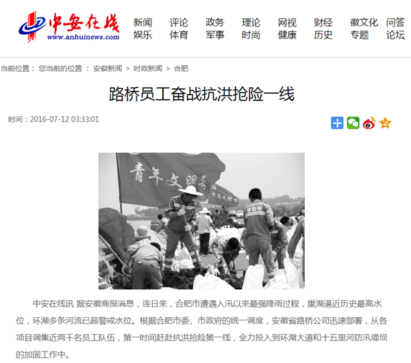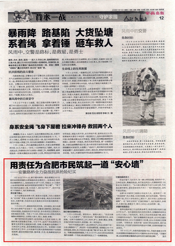 省級媒體聚焦公司抗洪搶險工作 發(fā)布時間:2016年07月13日 來源:黨委辦公室 發(fā)布人: 作者:王東 瀏覽:4240次 近日,公司積極響應合肥市委、市政府號召,全力參與環(huán)湖大道和十五里河抗洪搶險的事跡得到社會的高度關注。7月12日、13日,中安在線、《安徽商報》等多家省級媒體對公司抗洪搶險事跡進行了連續(xù)報道。
