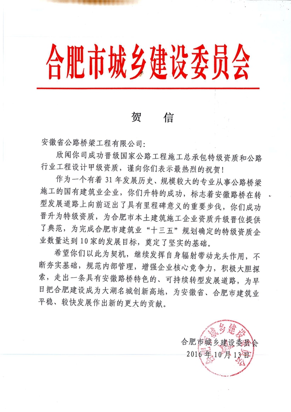 近日,合肥市城鄉(xiāng)建設委員會向公司發(fā)來賀信,熱烈祝賀公司晉升國家公路工程施工總承包特級資質(zhì)和公路行業(yè)工程設計甲級資質(zhì)。