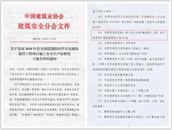 近日,從中國(guó)建筑業(yè)協(xié)會(huì)建筑安全分會(huì)傳來(lái)喜訊,公司承建的阜陽(yáng)北路高架01標(biāo)和合寧高速改擴(kuò)建路基路面工程05標(biāo)兩項(xiàng)工程榮獲“2018年全國(guó)建設(shè)工程項(xiàng)目施工安全生產(chǎn)標(biāo)準(zhǔn)化工地”榮譽(yù)稱號(hào)。
