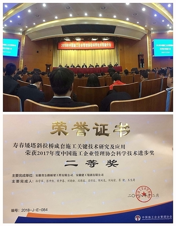 12月26日,“2018年中國施工企業(yè)管理協(xié)會科學技術獎勵大會” 在北京召開,公司主持的課題成果“壽春矮塔斜拉橋成套施工關鍵技術研究及應用”經(jīng)過專家評審,被鑒定為國際先進水平,榮獲二等獎并接受了表彰。