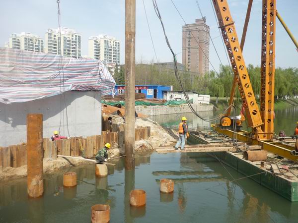 項(xiàng)目部自3月13日開打河中鋼管樁以來,克服了合肥市連續(xù)陰雨天氣和南淝河生態(tài)補(bǔ)水的影響,并努力克服了夜間不能作業(yè)的影響,在異常緊迫的工期壓力下,于4月初完成右半幅一百多根鋼管樁的打設(shè)作業(yè)。并在右半幅貝雷架架設(shè)完成后,開始進(jìn)行左半幅鋼管樁的打設(shè)作業(yè)。目前河中鋼管樁和承臺(tái)鋼管樁打設(shè)已經(jīng)全部完成,下一步,項(xiàng)目部將進(jìn)行左半幅滿堂架施工。