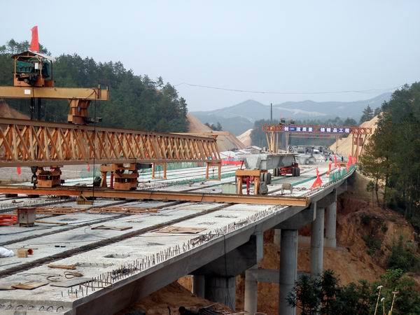 站塘高架橋位于會(huì)昌縣站塘鄉(xiāng),中心樁號(hào)問為K1498+450。大橋全長(zhǎng)135米,共5跨,上部結(jié)構(gòu)為連續(xù)預(yù)應(yīng)力箱梁。10月5日,站塘大橋開始架設(shè)第一片箱梁,經(jīng)過一個(gè)多月的努力施工,終于全幅貫通。
