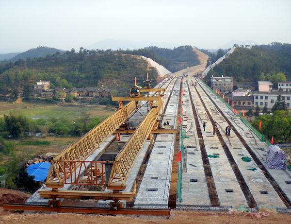 站塘大橋的中心樁號(hào)為K1497+532,全長(zhǎng)306米,共12跨,是我標(biāo)段最長(zhǎng)的一座大橋。上部構(gòu)造為25米預(yù)應(yīng)力箱梁,共96片,下部結(jié)構(gòu)共有樁基52根、蓋梁26片。站塘大橋的梁板是從2號(hào)梁場(chǎng)運(yùn)過(guò)來(lái)的。在運(yùn)梁過(guò)程中,由于遇到連陰雨天氣,導(dǎo)致道路潮濕,不能承受梁板的重量。針對(duì)這種情況,項(xiàng)目部積極開(kāi)拓思路想辦法,不等不靠,通過(guò)用碎沙石鋪出一條道路來(lái)保證運(yùn)梁不受影響。在春節(jié)復(fù)工后,項(xiàng)目部又加大人力物力投入。架梁過(guò)程中,橋梁技術(shù)人員始終堅(jiān)守在施工一線(xiàn),做好分部分項(xiàng)技術(shù)交底和安全防護(hù)工作,保證了架梁的進(jìn)度、質(zhì)量和安全。