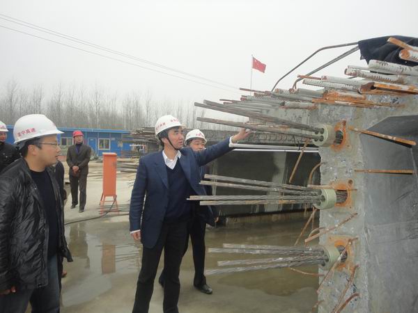 視察過程中,何站長對我部預(yù)制梁場的施工質(zhì)量、工藝給予了充分的肯定和贊揚(yáng),通過察看安全警示牌、詢問現(xiàn)場安全員,對我部安全工作的全面細(xì)致也豎起了大拇指,并對我安徽省公路橋梁工程公司表達(dá)了由衷的贊許。在肯定我們的工作成績的同時,何站長也要求我們要繼承和發(fā)揚(yáng)安徽省路橋公司的優(yōu)良傳統(tǒng),細(xì)化工作、進(jìn)一步提高工程質(zhì)量。