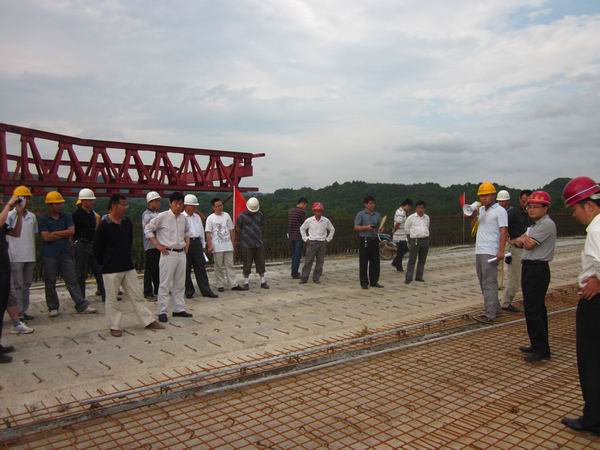 下午15:30,在大廣高速龍楊段項目辦、高駐辦相關領導帶領下,全線各高駐辦、施工單位主要負責人徒步參觀了我標江口大橋施工現(xiàn)場。實地考察中,我標項目經(jīng)理羅權針對水混凝土橋面鋪裝施工情況作了簡要介紹,并就部分施工細節(jié)問題與觀摩團進行了深入交流。