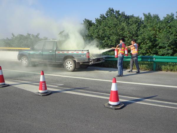 16:40,隨著蕪宣高速公路管理公司副總經(jīng)理郭建華的一聲令下,蕪宣養(yǎng)護(hù)項(xiàng)目組織開展的突發(fā)交通事故處置聯(lián)合演練開始。16時(shí)45分,事故車輛撞向錐標(biāo),沖入封閉區(qū)并撞壞護(hù)欄。16:46,巡標(biāo)員發(fā)現(xiàn)事故,立刻補(bǔ)齊被撞倒錐標(biāo),并向項(xiàng)目安全環(huán)保部負(fù)責(zé)人報(bào)告;同時(shí)安排其他巡標(biāo)員到事故車輛后方搖旗警示。16:48,項(xiàng)目安全環(huán)保部負(fù)責(zé)人李剛就事故情況報(bào)告監(jiān)控中心,并向項(xiàng)目應(yīng)急救援小組組長曹祝林匯報(bào)事故情況。16:54,蕪湖市高速交警一大隊(duì)巡警及施救組趕到事故現(xiàn)場,組織對(duì)駕駛員進(jìn)行營救。16:55,施救組成員對(duì)受傷駕駛員傷口進(jìn)行消毒、包扎。16:57,事故車輛起火。16:58,項(xiàng)目應(yīng)急救援小組成員對(duì)事故車輛進(jìn)行滅火。17:02,路政部門到達(dá)現(xiàn)場,對(duì)事故車輛進(jìn)行勘察,并向陪乘人員了解事故情況及駕駛員情況。17:11,對(duì)蕪宣方向車輛進(jìn)行管制。17:34,清障車在未知情情況下進(jìn)入事故現(xiàn)場,對(duì)事故車輛進(jìn)行施救。17:39,蕪宣方向交通開放,在交警、路政、項(xiàng)目巡標(biāo)員的指揮下緩慢行走。17:41,清掃組對(duì)事故現(xiàn)場的拋灑物、撞壞的錐標(biāo)等進(jìn)行清掃。17:45,交通恢復(fù)正常,郭建華總指揮宣布演練結(jié)束。